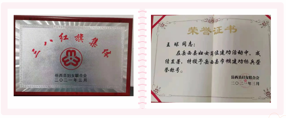 近年来,岳西县检察院高度重视妇女工作,以党建促妇建,成效显著。在院党组的关心关爱下,该院涌现出一批女职工个人和集体先进典型,多名女职工及集体获市、县三八红旗手、巾帼建功标兵、最美人民卫士、巾帼文明岗、青年文明号等荣誉,并有多名女干警在上级业务竞赛中获奖,涌现出一批省、市级优秀公诉人、未检业务能手、案管业务能手、检察业务尖子等业务标兵。其中,王球同志被县妇联授予2020年度“巾帼建功标兵”,第二检察部被县妇联授予2020年度“三八红旗集体”。