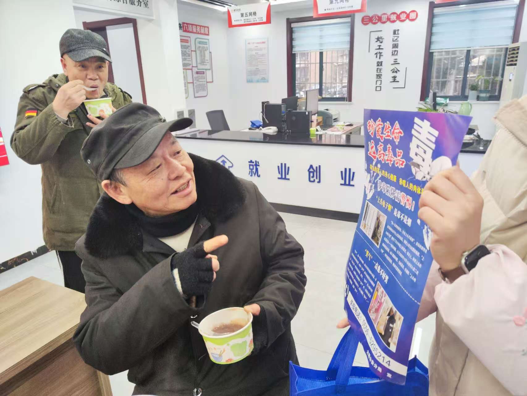 1月26日下午,高花社区新时代文明实践站里,“粥香邻里 情满腊八”活动暖融融地展开了。为街坊邻居、环卫工人们送上温热香甜的腊八粥与节日祝福。与此同时工作人员在现场向前来喝腊八粥的群众、环卫工人发放禁种铲毒宣传资料,讲解禁毒相关知识,同时普及“笑气”“依托咪酯”等易成瘾物质的外观特征和滥用危害,并叮嘱群众要提高防范意识,加强自我保护,做好自身防范的同时也积极参与禁毒宣传。