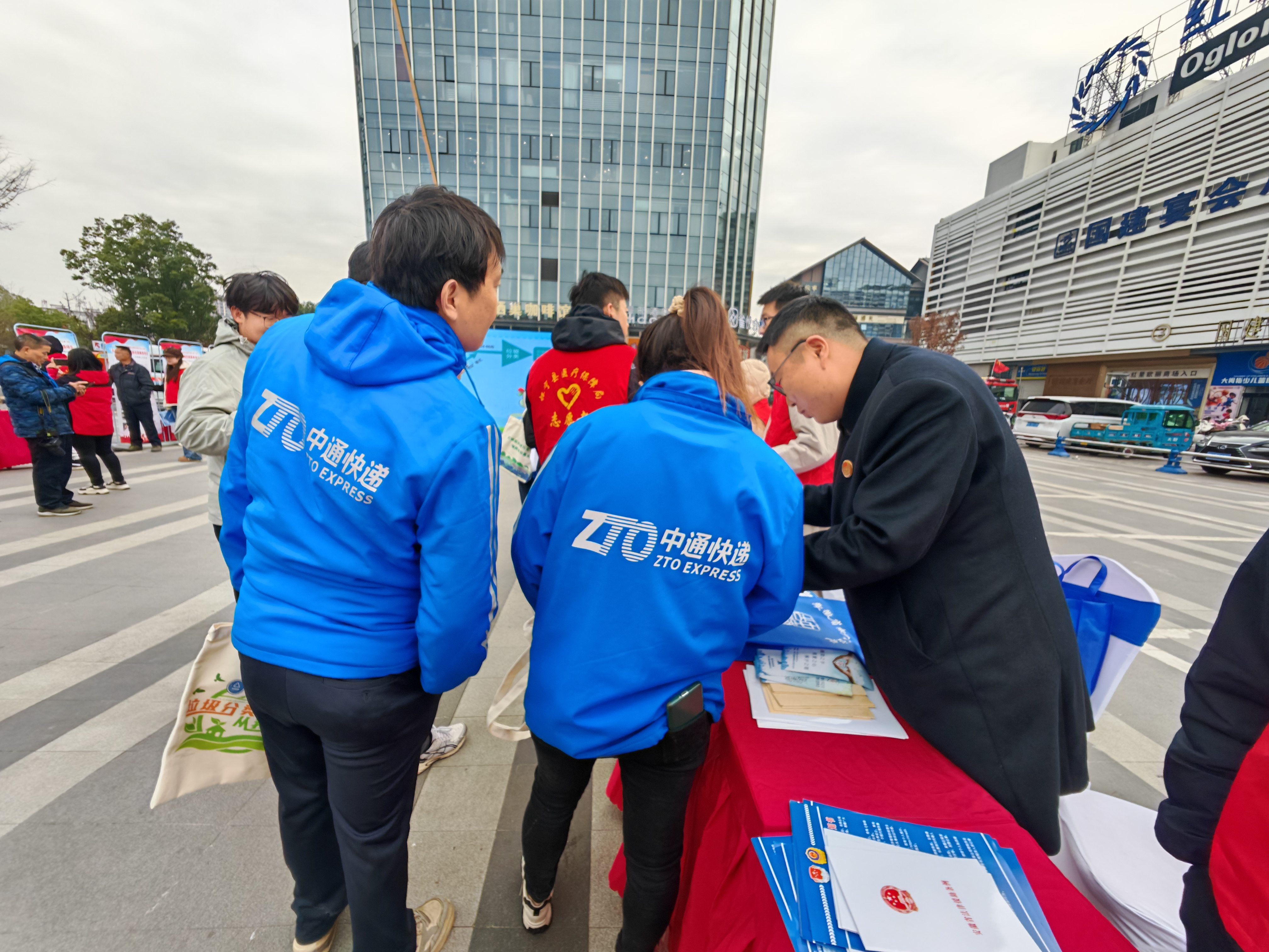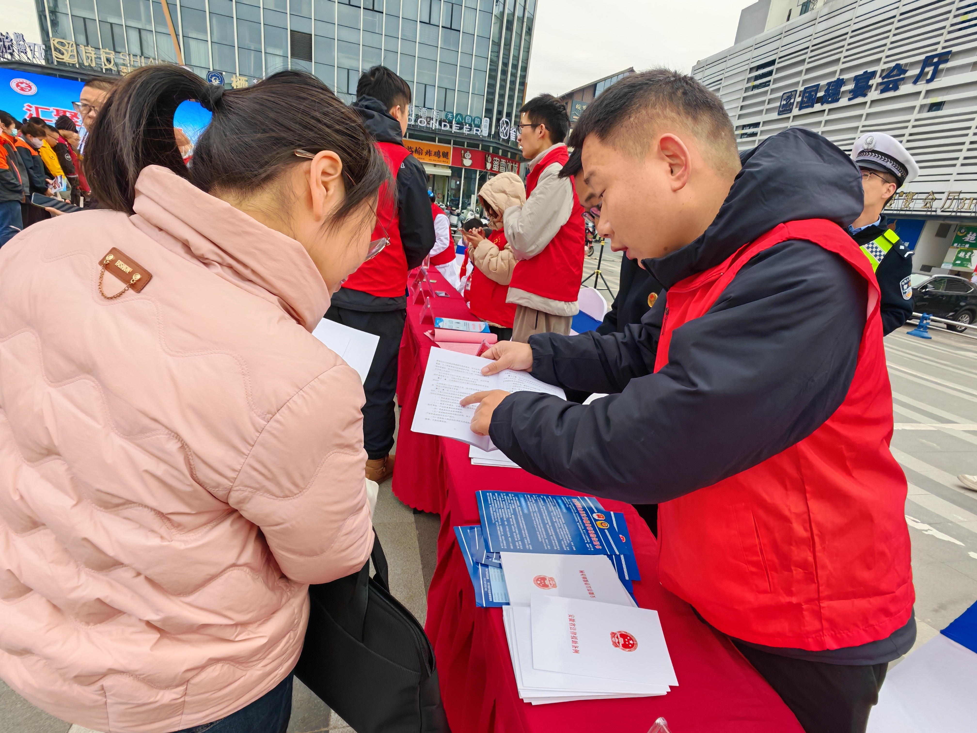 12 月 5 日上午,恰逢国际志愿者日,怀宁县司法局联合县委社会工作部、总工会、人社局等部门,在怀宁龠街商业街广场开展 “法援惠民生 关爱新就业群体” 专项宣传活动,聚焦外卖配送员、快递员等新就业群体,将法律援助服务送到一线,以法治服务践行志愿精神。