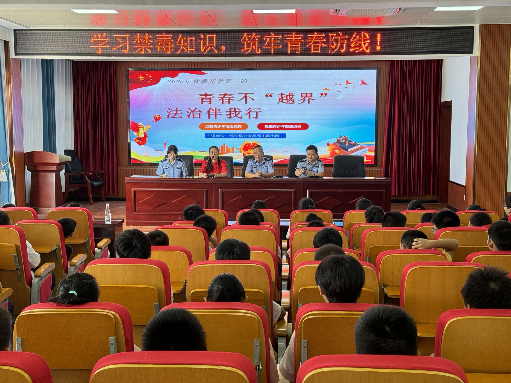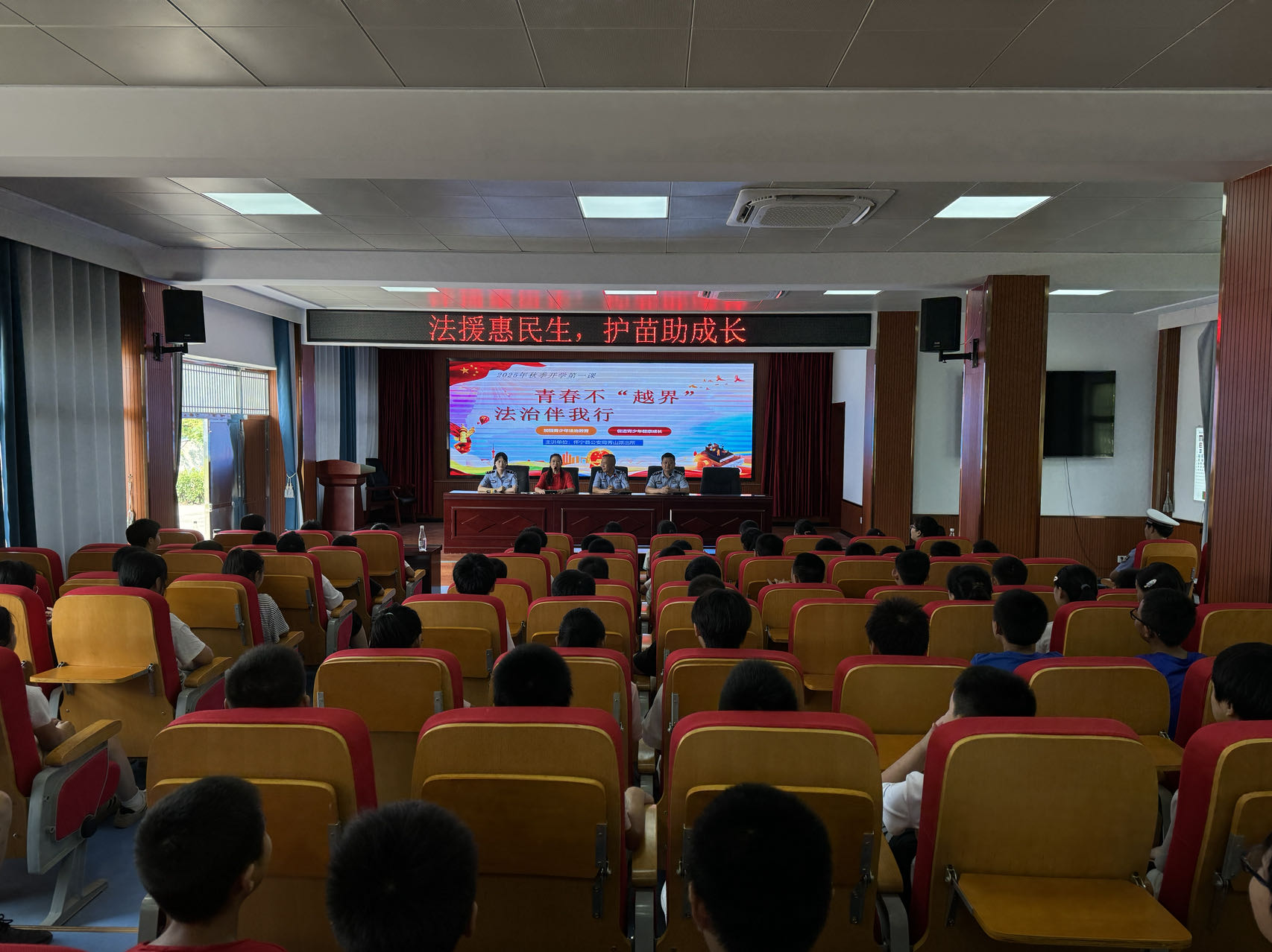 为进一步增强学生法治观念,提高自我保护意识,营造平安和谐的校园环境,9月5日上午,秀山初中开展以“法治伴我行,青春不‘越界’”为主题的开学法治第一课普法宣传活动。