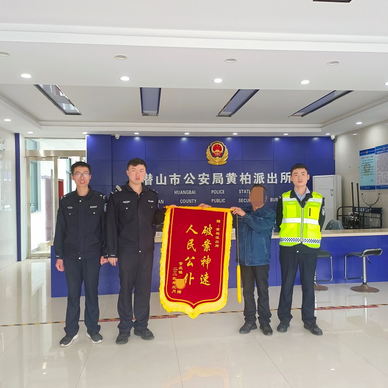 近日,潜山市官庄镇居民倪先生将一面印有“破案神速人民公仆”的锦旗送到潜山市公安局黄柏派出所民警手中,对民警快速破案表示感谢。