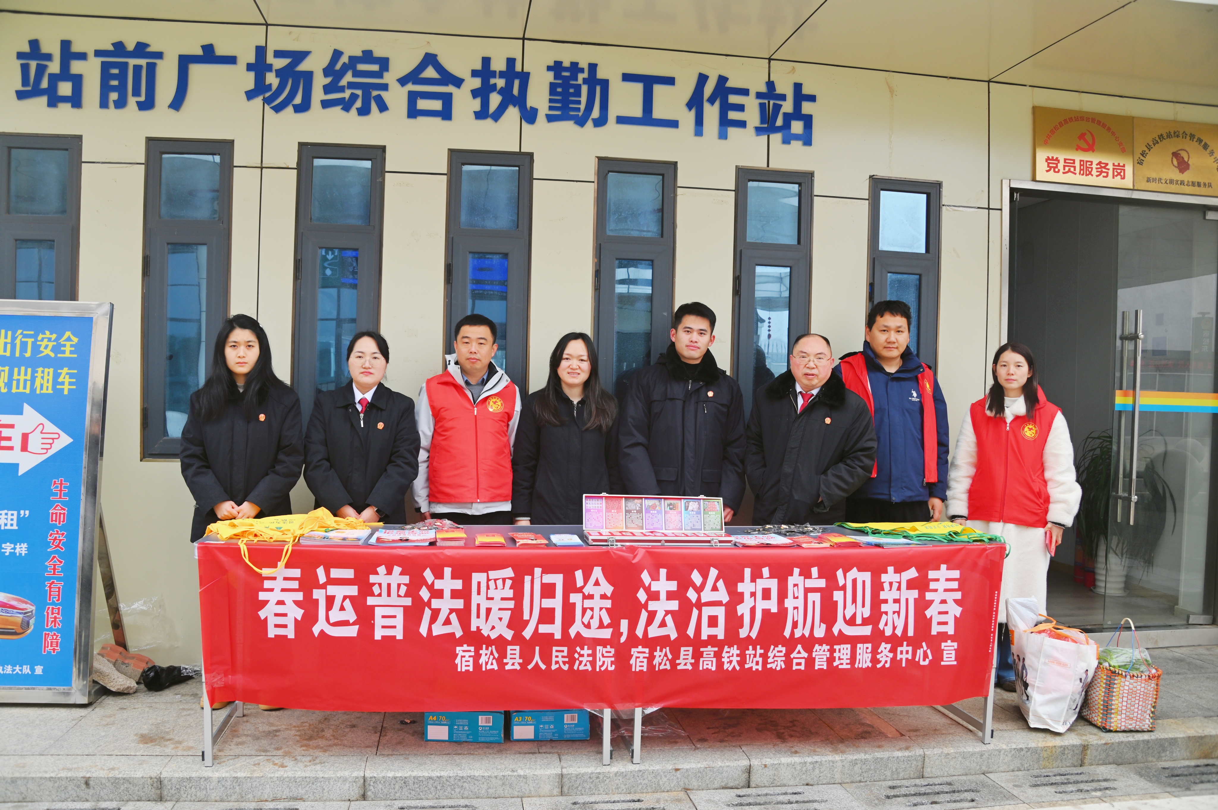 2月11日上午,宿松县人民法院组织党员干警走进宿松东站,与宿松县高铁站综合管理服务中心党员联合开展“春运普法暖归途 法治护航迎新春”主题党日活动,把法治宣传、平安提醒送到旅客身边,以司法温情守护返乡路,持续擦亮“法·爱松兹”党建品牌。