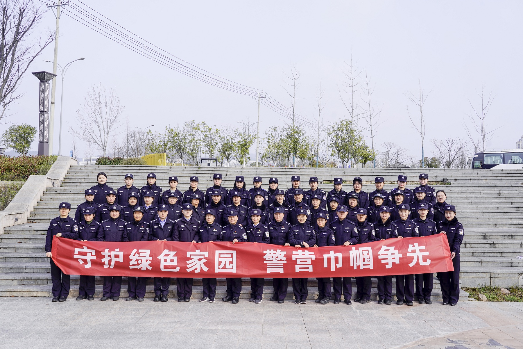 早晨的花溪公园,春意盎然。上午8时许,全体女警精神饱满,整齐列队于县城花溪公园入口,静待启程。