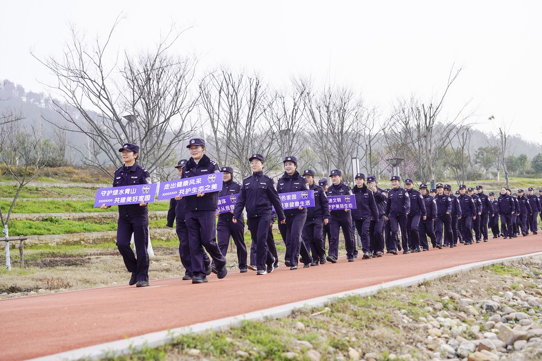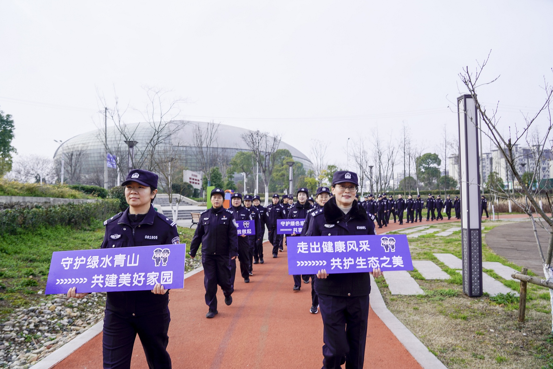 队伍前列,女警们高举主题宣传牌,如绿色航标般引领队伍。“走出健康风采 共护生态之美”、“守护绿水青山 共建美好家园”……醒目的标语在阳光下熠熠生辉。随着一声令下,队伍沿环形步道匀速前行,铿锵有力的步伐叩击着地面,汇成一股昂扬向上的律动。