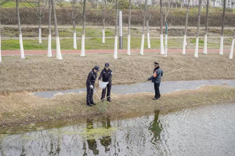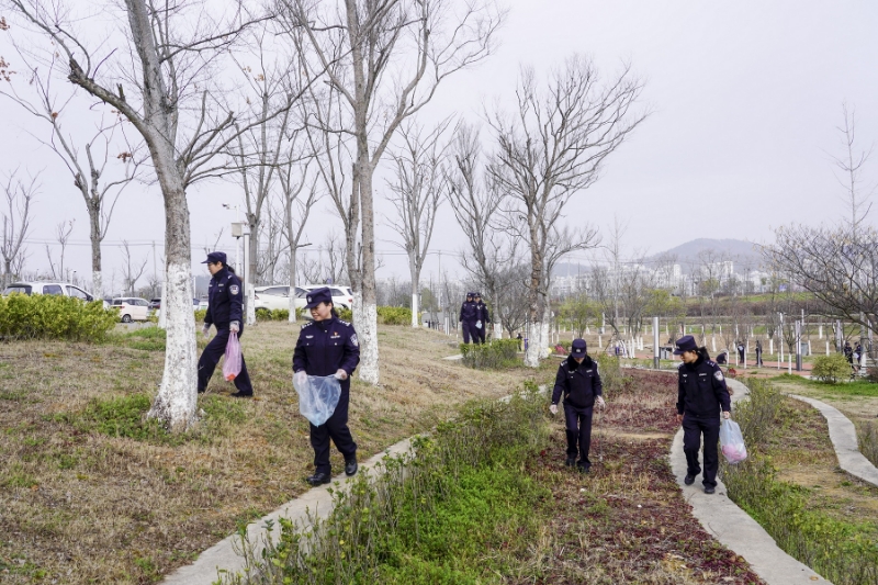现场,草坪与花坛间散落着零星纸屑、塑料袋与烟蒂。女警们手持垃圾袋与垃圾夹,俯身、捡拾、分类、装袋,一系列动作娴熟流畅。她们不怕脏、不怕累,拨开草丛寻遗落,沿着步道找死角,配合环卫工人打捞景观塘里面的漂浮物。每一次弯腰,都是对环境的敬畏;每一个垃圾袋的装满,都是对绿色的捍卫。