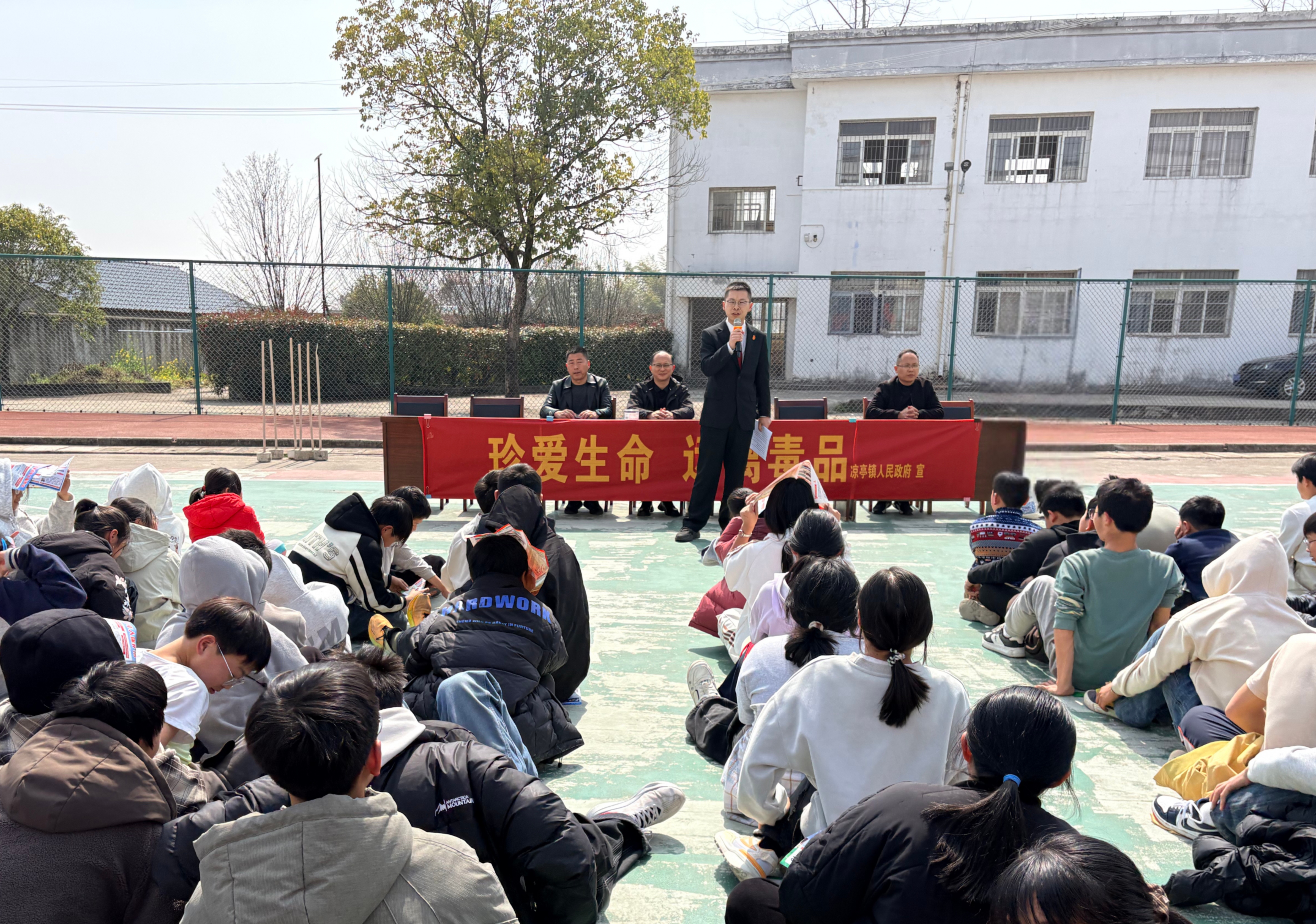 活动操场微风和煦春光明媚,同学们席地而坐热情高涨。综治中心工作人员结合展示模型讲解了毒品的危害及如何识别毒品,从而引导大家自觉远离毒品。“亭”有法普法队员以小明拿压岁钱买自行车的故事为切入点,并现场邀请同学们参与游戏“你比我猜”,以生动有趣的形式将《中华人民共和国民法典》中的“自然人”、“未成年人”、“限制民事行为能力人”、“监护人”、“效力待定”、“追认”、“物权”、“侵权”等概念串联起来融入故事,让大家沉浸式学法,进一步感受到民法典与我们的生活息息相关,在同学们心中播下了法治的种子。