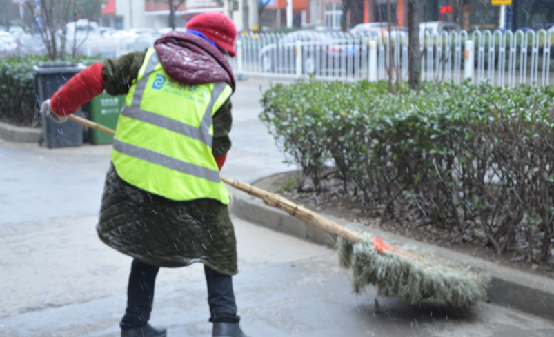 上午8点五十分,天空中飘着雪花,行人要么裹得严严实实,要么撑着雨伞遮挡风雪。在孚玉中路,一名环卫工人拿着大扫把正低头认真地清扫着地上的垃圾,衣服上落下了薄薄的一层雪,她顾不上拍下身上的积雪,一会用手捡着绿化带里的垃圾,一会擦擦垃圾桶的污垢,时不时的哈气搓手温暖冻红的双手。她叫石莲娇,刚刚加入环卫队伍不久。“天气冷,干活要慢点,我早上四点多就提前上路了,希望孩子们上学时能看到一条干干净净的路”石莲娇笑着说。像石莲娇一样在寒冬中坚守岗位的环卫工人还有很多,他们当中很多都已年过半百,本该享受天伦之乐,为了城市的干净整洁却依然默默无私奉献、无怨无悔。