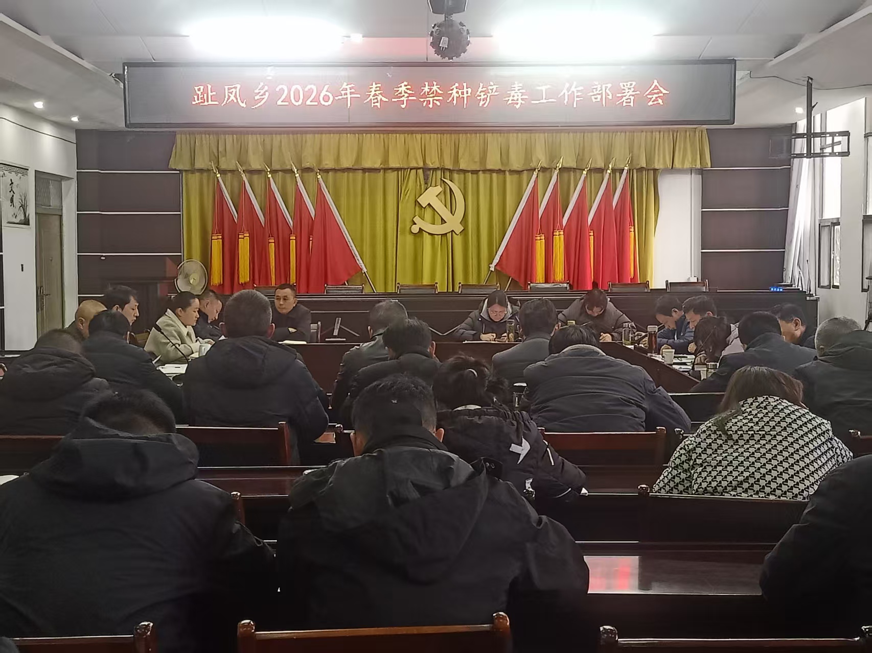 为有效遏制非法种植毒品原植物行为,加强源头治理,确保辖区内无一棵毒品原植物落地开花,3月18日,趾凤乡召开2026年春季禁种铲毒工作部署会,该乡党委副书记、乡长苏琦主持会议,全体乡村干部参会。