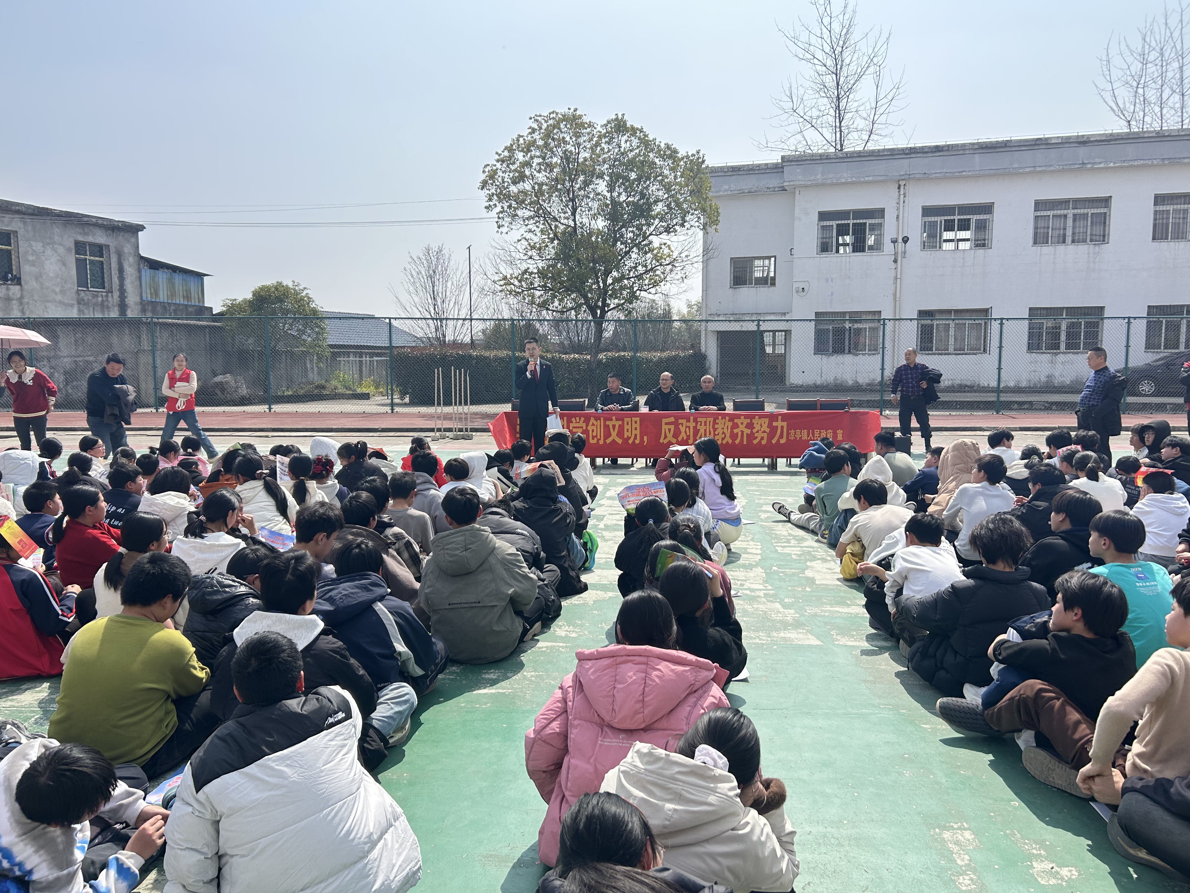 活动伊始,工作人员与志愿者们分工协作,在校园教学楼、操场、校门口等显眼位置,张贴“崇尚科学创文明,反对邪教齐努力”反邪教横幅。鲜红的横幅格外醒目,不仅装点了校园,更将反邪理念直观传递给每一位师生,让“远离邪教、崇尚科学”的观念深入人心,迅速营造出全员参与、共同抵制邪教的浓厚氛围,为活动开展奠定了良好基础。