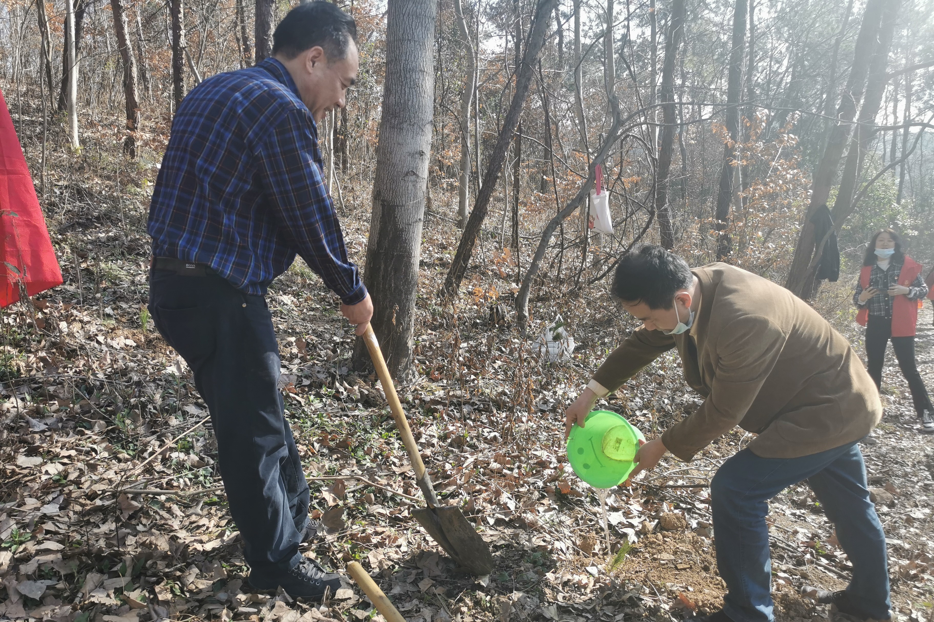 植树过程中,市委政法委常务副书记郝建彬带领机关干部分工协作,一起挥锹铲土、扶直苗木、培土浇水,现场呈现一片繁忙有序、热火朝天的劳动景象。最终,在大家的共同努力下,三十余棵树苗在这里“安家落户”,迎风挺立。