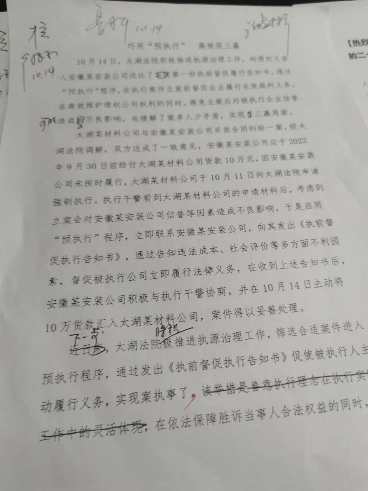 太湖某材料公司与安徽某安装公司买卖合同纠纷一案,经太湖法院调解,双方达成了一致意见,安徽某安装公司应于2022年9月30日前给付太湖某材料公司货款10万元,因安徽某安装公司未按时履行,太湖某材料公司于10月11日向太湖法院申请强制执行。执行干警看到太湖某材料公司的申请材料后,考虑到立案会对安徽某安装公司信誉等因素造成不良影响,于是启用“预执行”程序,立即联系安徽某安装公司,向其发出《执前督促执行告知书》,通过告知违法成本、社会评价等多方面不利因素,督促被执行公司立即履行法律义务,在收到上述告知书后,安徽某安装公司积极与执行干警协商,并在10月14日主动将10万货款汇入太湖某材料公司,案件得以妥善处理。