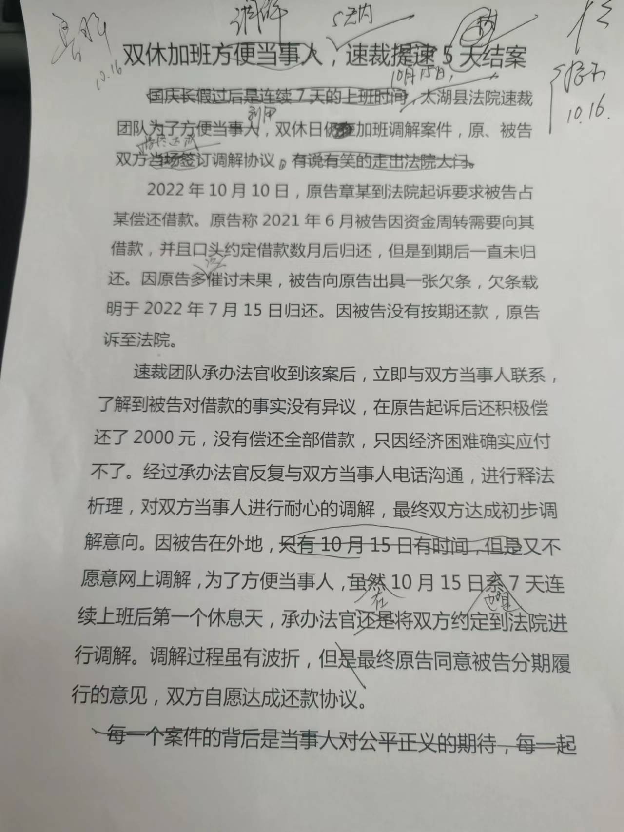 10月15日,太湖县法院速裁团队利用双休日加班调解案件,原、被告双方最终达成调解协议。