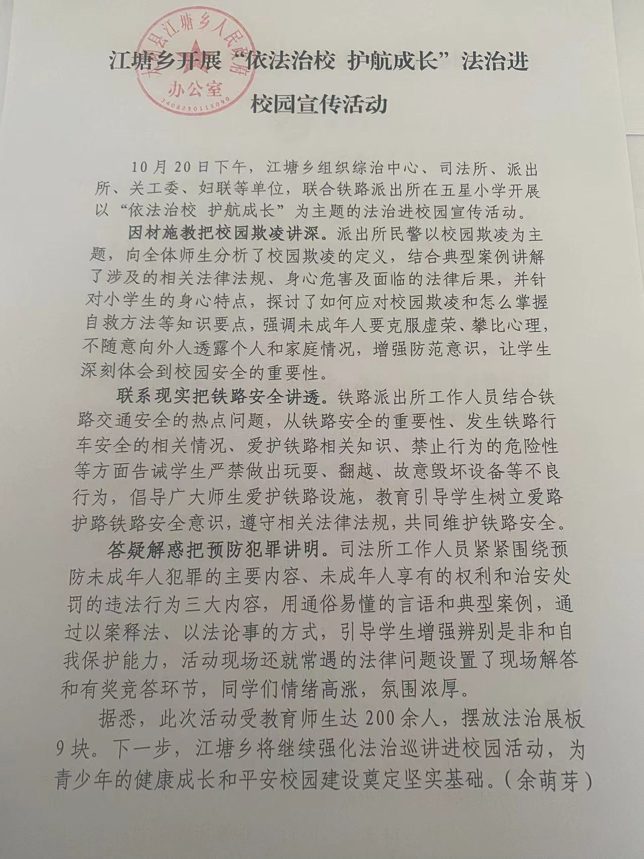 10月20日下午,江塘乡组织综治中心、司法所、派出所、关工委、妇联等单位,联合铁路派出所在五星小学开展以“依法治校 护航成长”为主题的法治进校园宣传活动。