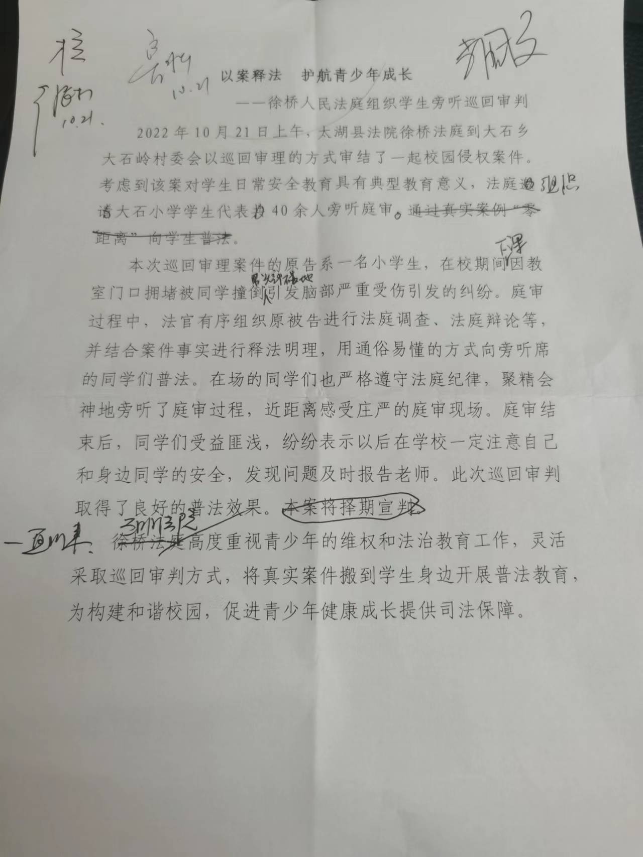 一直以来,太湖法院高度重视青少年的维权和法治教育工作,灵活采取巡回审判方式,将真实案件搬到学生身边开展普法教育,为构建和谐校园,促进青少年健康成长提供司法保障。(作者:倪敏 初审:李国文、徐长松 终审:鲁水华)