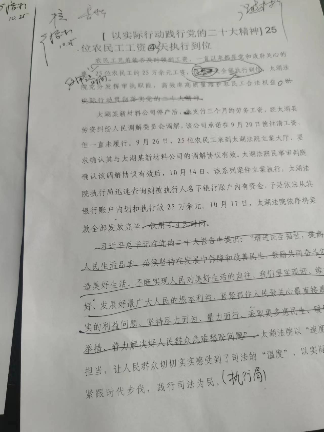 农民工兄弟能否及时领到工资,一直以来都是党和政府关心的事。近日,太湖法院充分发挥职能,仅用4天时间就将25位农民工的25万余元工资全部执行到位,高效率高质量维护了农民工合法权益。