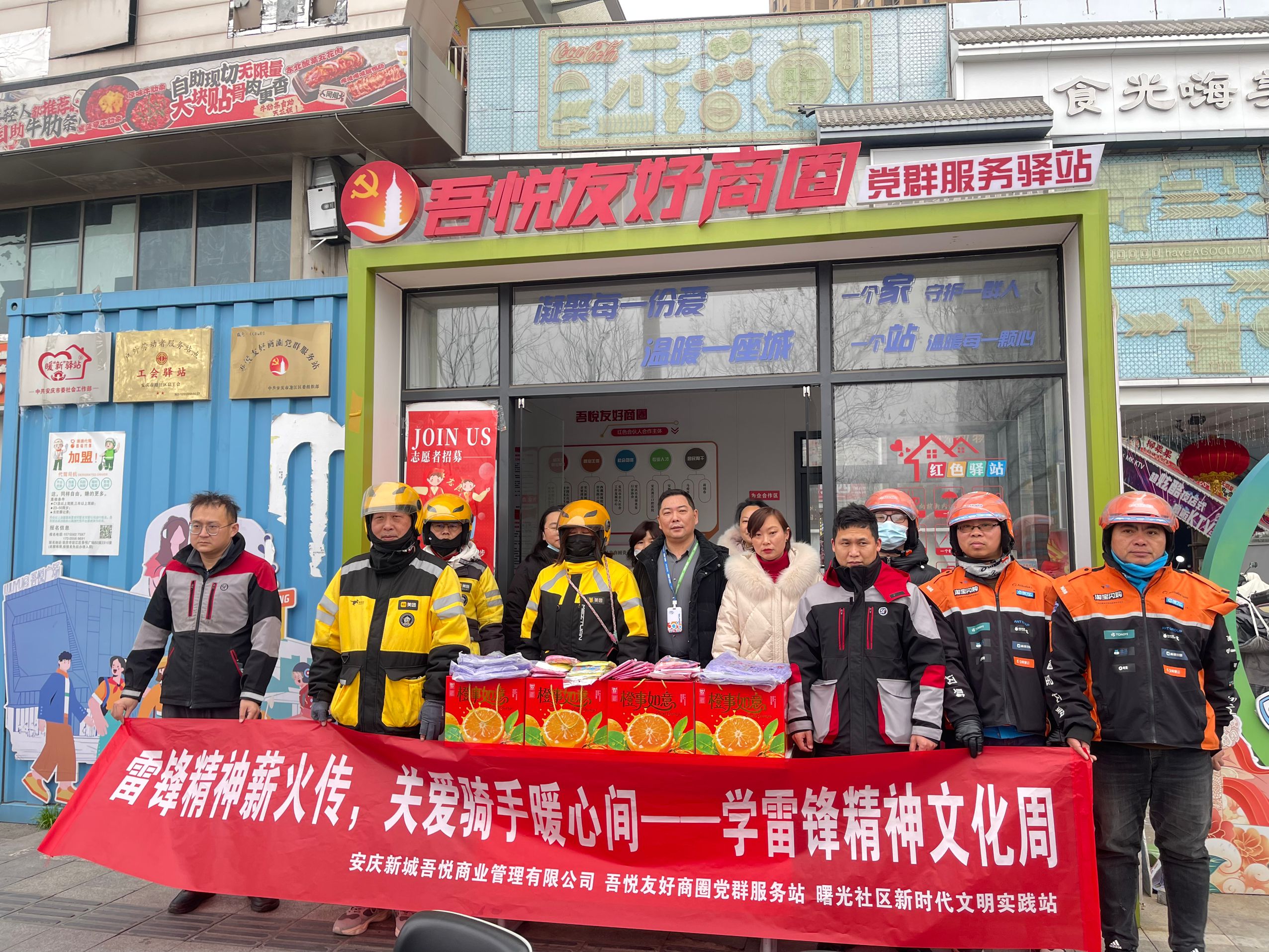 为弘扬新时代雷锋精神,传递社会关爱,3月4日,曙光社区联合安庆新城吾悦商业管理有限公司共同开展“学雷锋精神文化周”活动,聚焦新就业群体,为辖区外卖小哥送上暖心礼包,用实际行动致敬“奔跑的雷锋”。