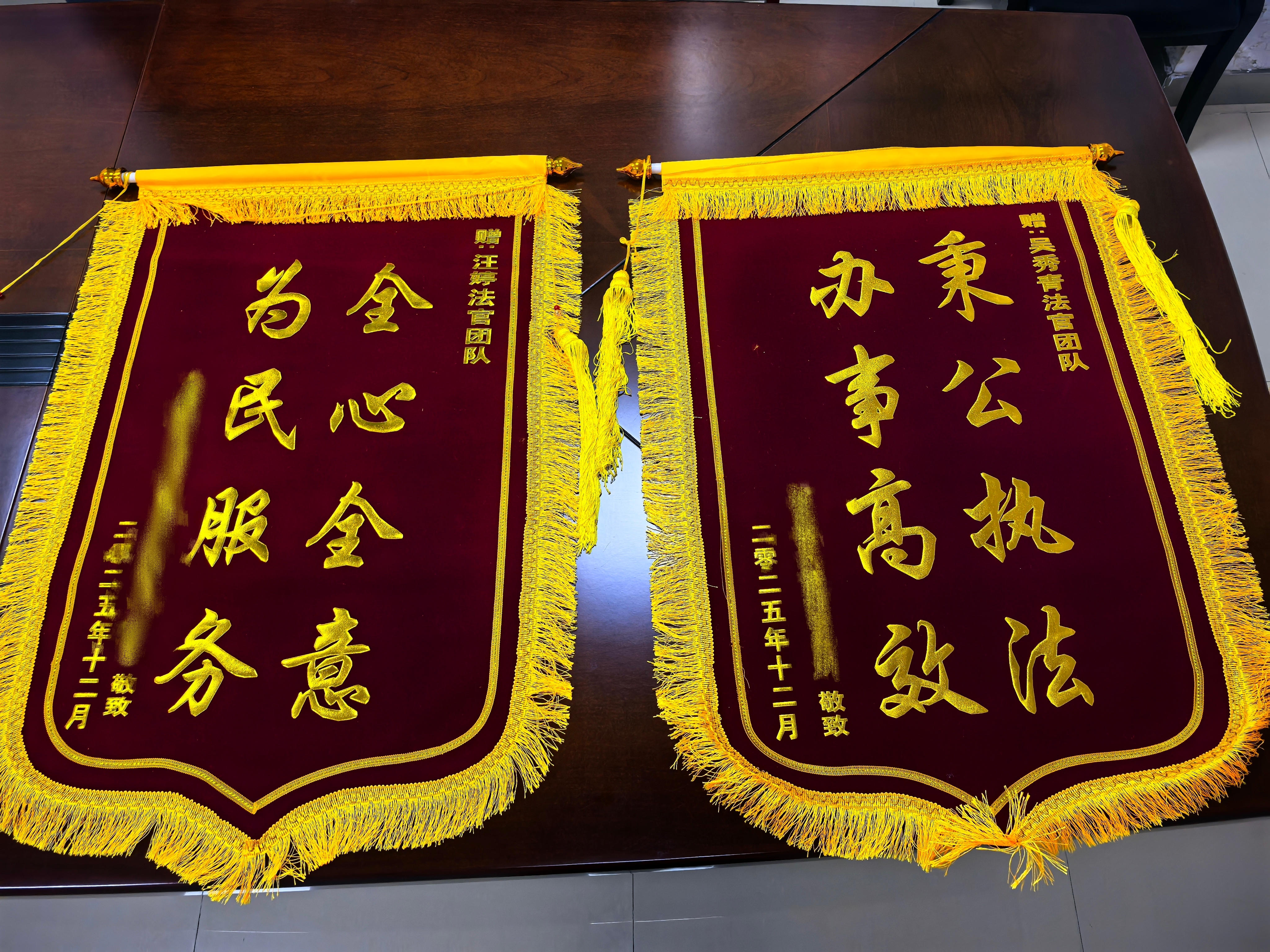 尤为令人庆贺的是,其中一面锦旗授予了入额仅两个月的青年法官吴秀青。这面锦旗既承载着人民群众的诚挚谢意,也映照着法庭干警司法为民的拳拳初心。