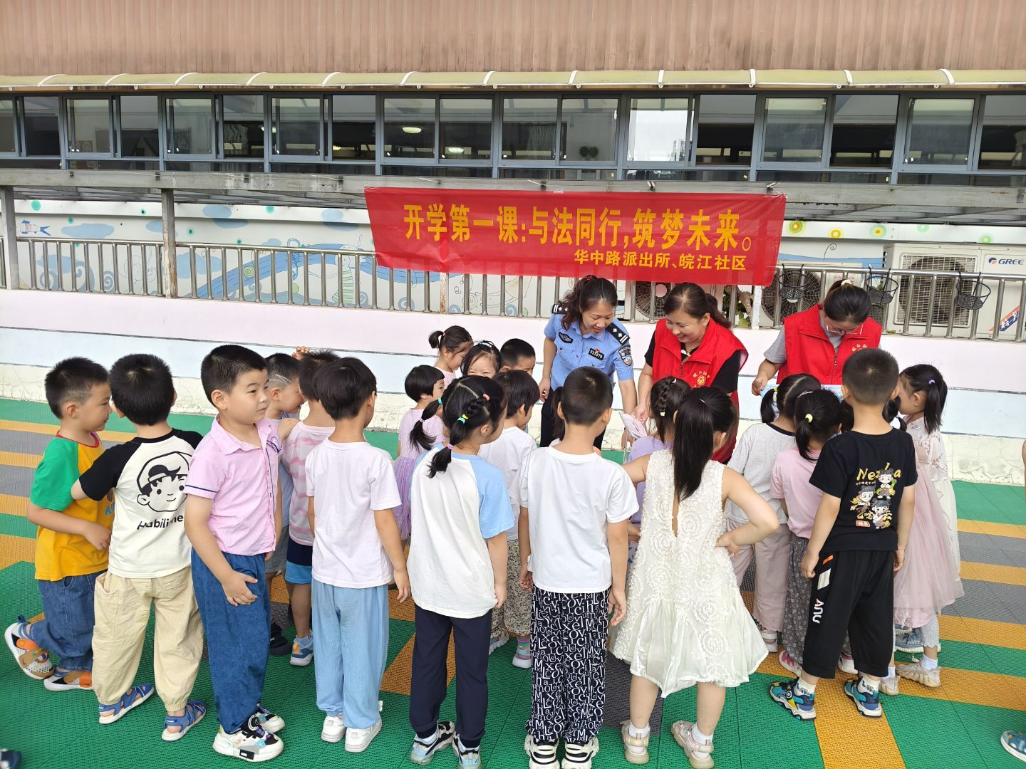 为进一步加强未成年人法治教育,筑牢校园安全防线,开学初,皖江社区联合华中司法所、华中路派出所走进御景国际幼儿园,开展“开学第一课”法治宣传教育活动。