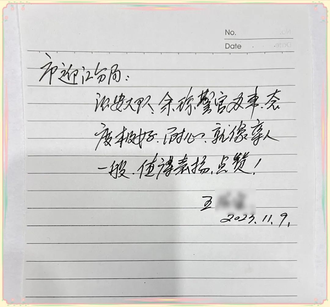 11月9日,“治安大队余琼警官办事,态度极好、耐心、就像亲人一般、就像亲人一样,值得表扬、点赞”一位七旬老人在一张纸条上写下这条留言,感谢迎江分局治安大队辅警余琼热心服务,帮助其办理相关证件。