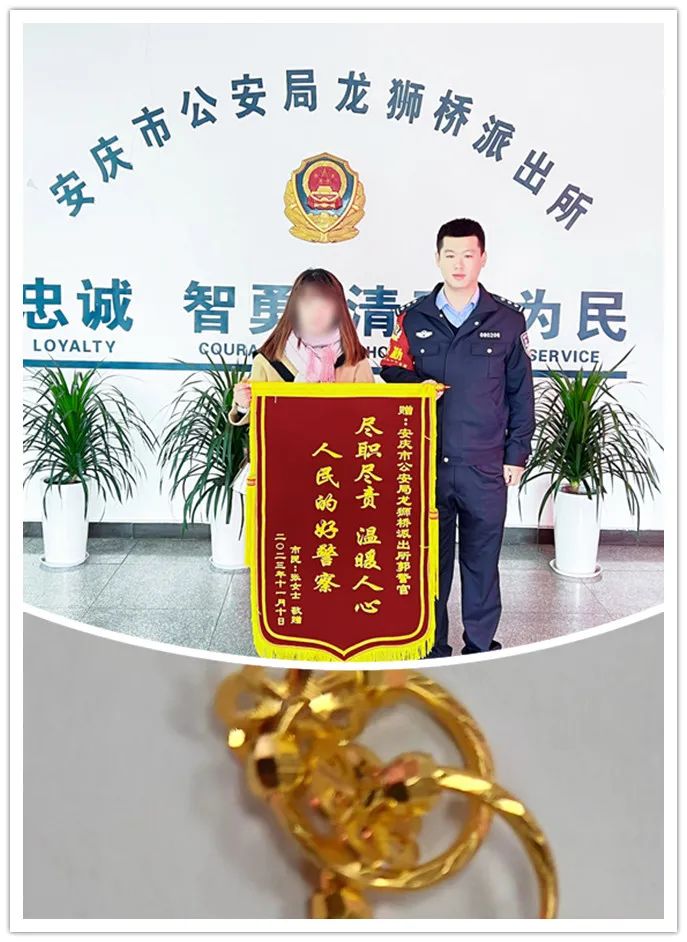 11月10日,因“双十一”活动火爆,一名金店柜台销售员在接待顾客时,错拿了一对同款不同黄金克重的耳环给了顾客,这与顾客挑选的价格差达2000余元,因事发突然,顾客离店后才发现。龙狮桥派出所民警接警后赶至现场,安慰柜台销售员的同时,通过大量查找走访,终于找到该名顾客,民警与之联系讲明事情缘由,上门向顾客耐心地解释说明,最终化解了双方的尴尬,将“失”(误)物完璧归赵。当天下午,销售员张女士特地携带一面印有“尽职尽责 温暖人心 人民的好警察”送至龙狮桥派出所感激民警帮其找回黄金耳饰。