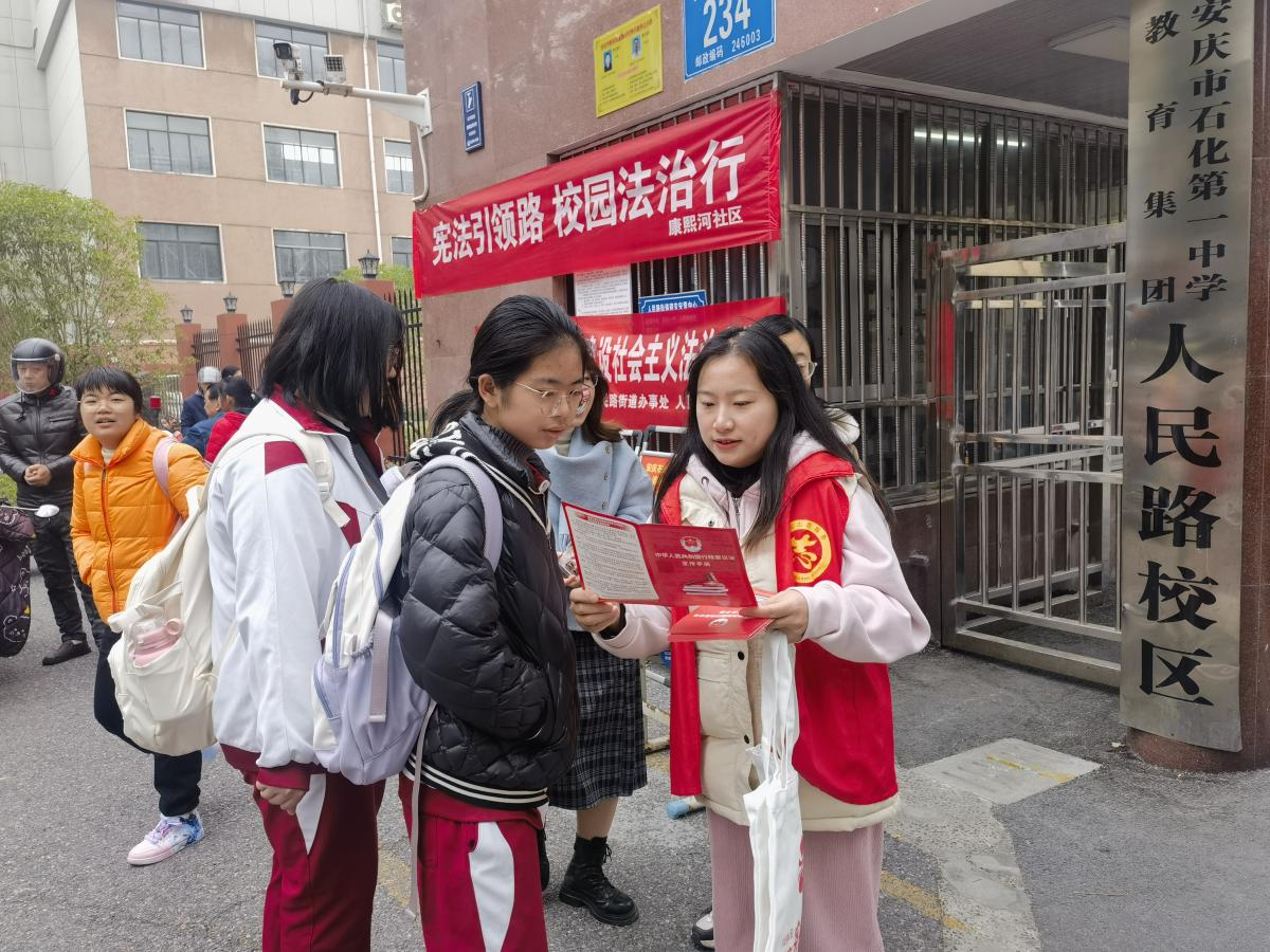 在第十一个国家宪法日来临之际,为提升学生的法治素养,增强学生的法治观念。12月3日,康熙河社区招募了一批热心公益、擅长表达的关协、妇联、工会志愿者,组成“宪法宣传团”开展宪法进校园主题宣传活动。