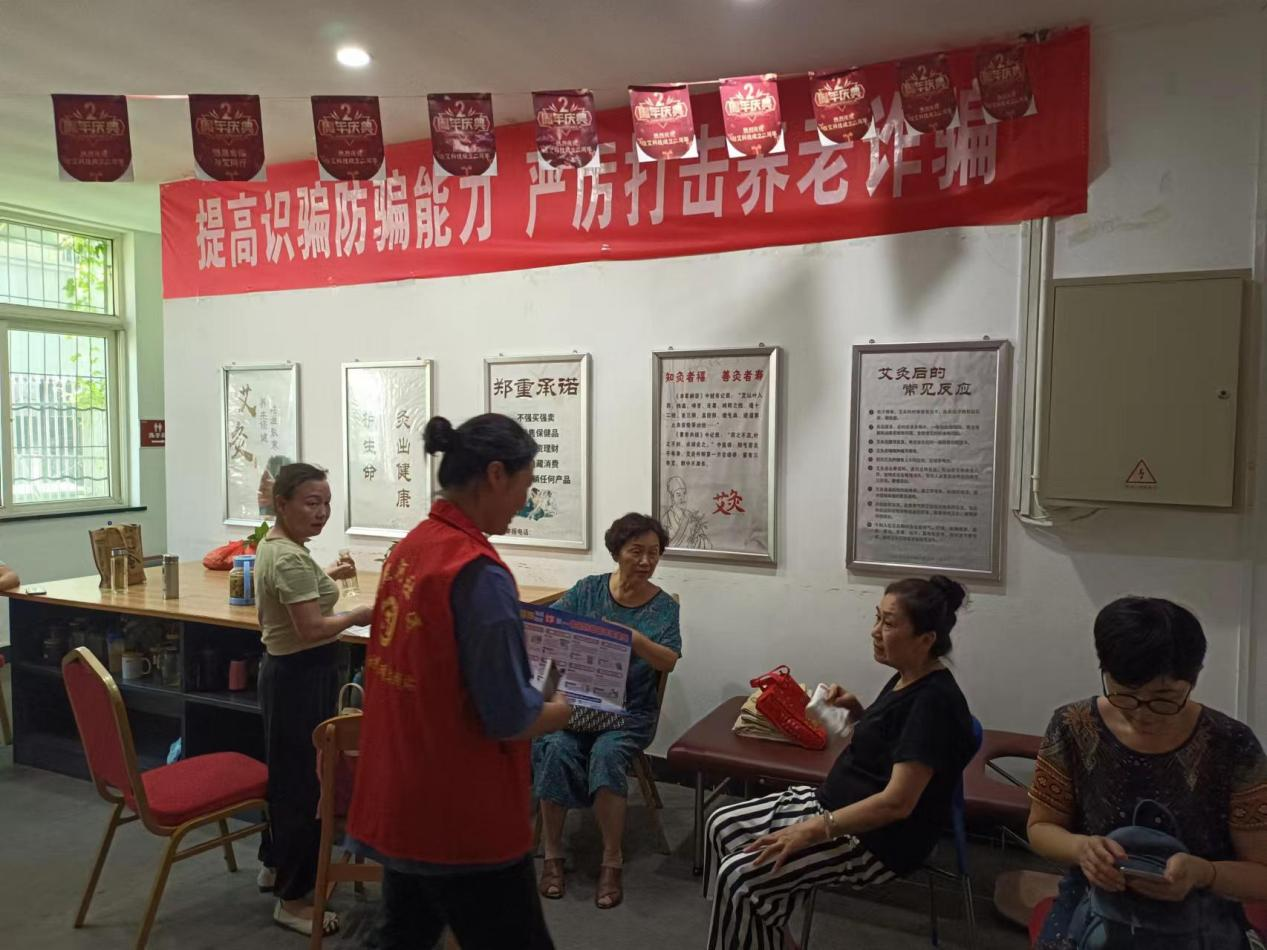 社区工作人员深入辖区内的老年艾灸馆等老年人休闲养生场所,用通俗易懂的语言给社区群众和老年人讲解电信诈骗的种类、特点,结合以往发生的电信诈骗案例,详细地讲解诈骗常用的作案手法和作案方式及预防宣传防电信诈骗知识,向辖区内的老年人宣传普及“养老服务诈骗”“老年人投资”“老年人保健产品”等诈骗手段,为老年居民讲解如何预防老年人诈骗的方法,提醒他们一定要提高安全防范意识,注意保护个人信息,不要轻易相信他人,确保自身生命及财产安全。同时提醒老年居民们不要向陌生人透露自己及家人的身份证号码、银行卡等重要信息,谨防上当受骗。