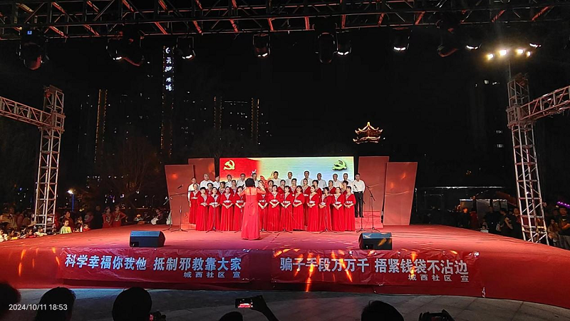 为进一步增强辖区居民群众反邪教的意识和能力,营造平安和谐的社区环境,10月11日晚,天堂镇城西社区党委结合“庆重阳 颂党恩”大型文艺汇演开展“科学幸福你我他 抵制邪教靠大家”主题党日活动。