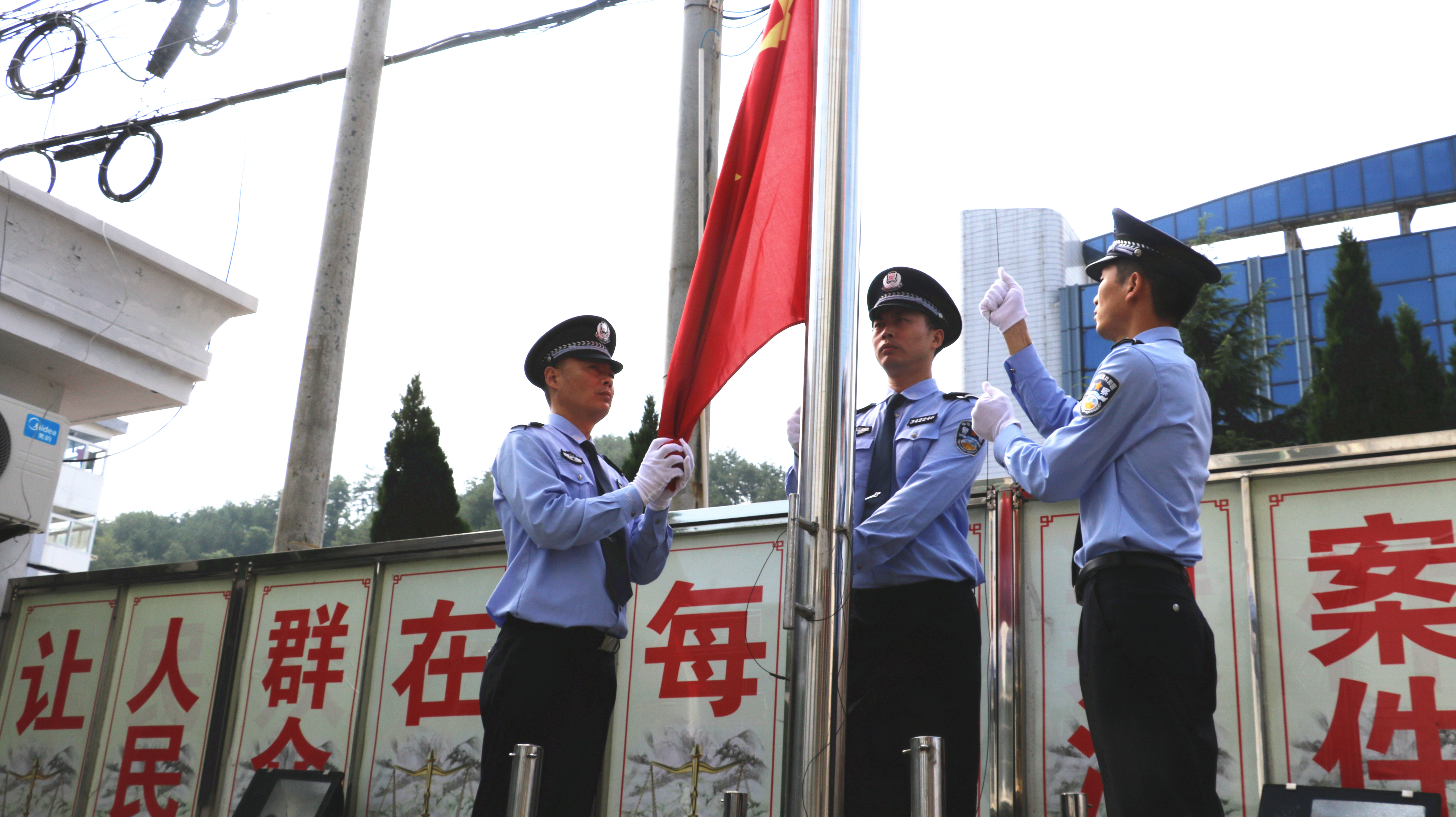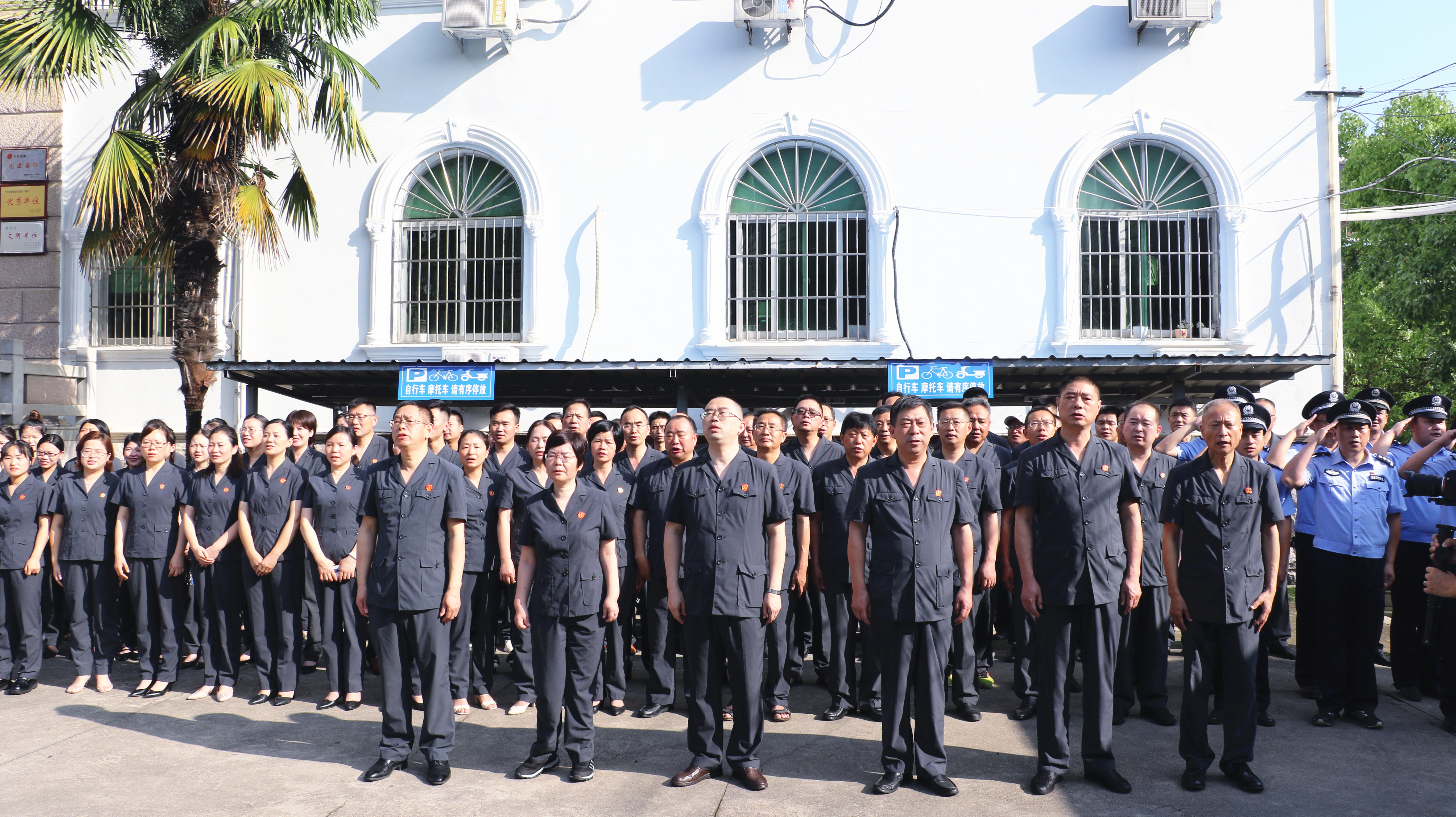 上午8时,法院全体干警在院内楼前整齐列队,伴随着激昂的《中华人民共和国国歌》,升旗手奋力挥臂,五星红旗冉冉升起,全体干警行注目礼。