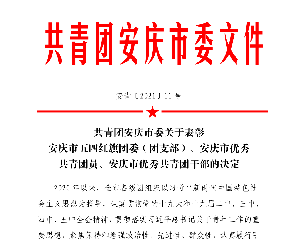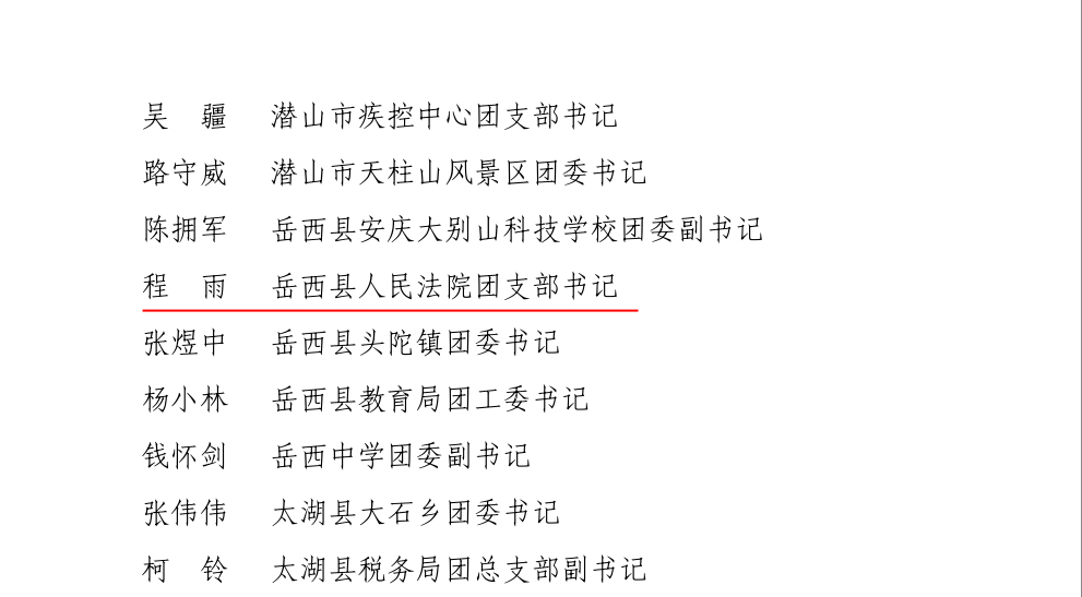 近期,共青团安庆市委发布《关于表彰安庆市五四红旗团委(团支部)、安庆市优秀共青团员、安庆市优秀共青团干部的决定》,岳西县人民法院立案庭员额法官、法院团支部书记程雨被授予 “安庆市优秀共青团干部”荣誉称号。