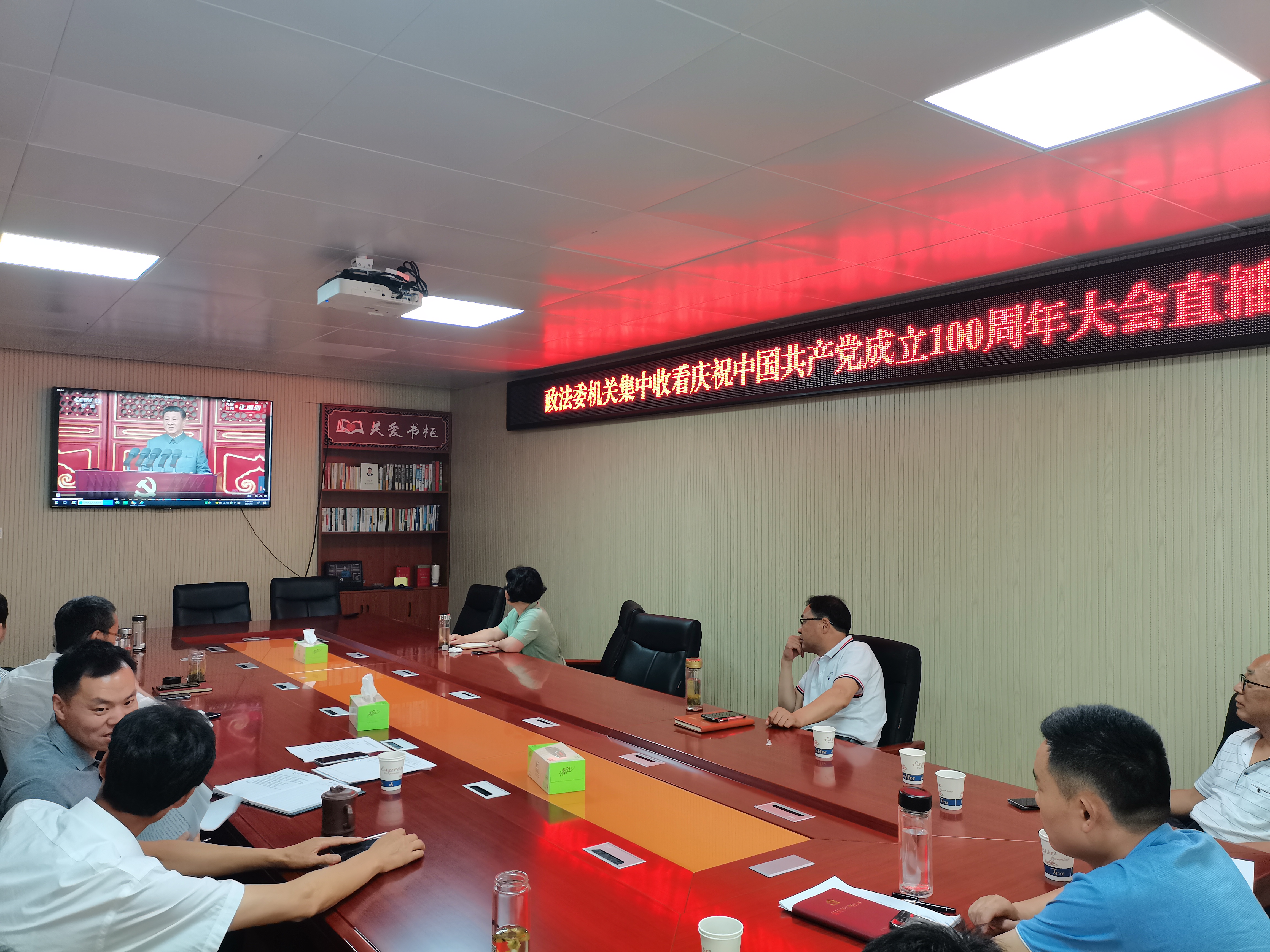 7月1日上午8时,庆祝中国共产党成立100周年大会在北京天安门广场隆重举行。中共中央总书记、国家主席、中央军委主席习近平发表重要讲话。岳西县委政法委机关全体干部收听收看了大会直播,第一时间了解大会盛况,共同见证举世瞩目的历史时刻。