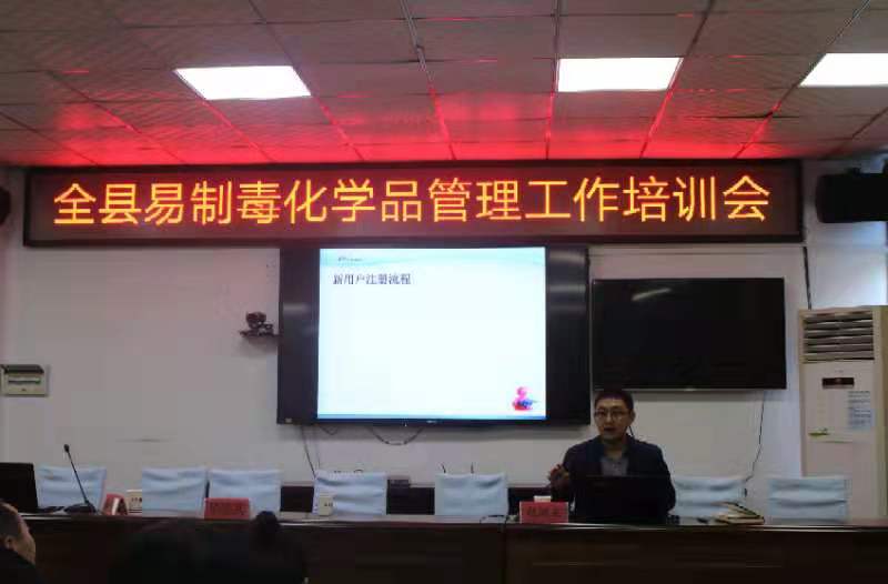 为进一步规范岳西县易制毒化学品安全管理工作,不断提高岳西县易制毒化学品企事业单位及从业人员的守法自律意识和管理能力,严防易制毒化学品流入非法渠道。11月29日,岳西县禁毒办举办了全县易制毒化学品管理工作培训班。岳西县禁毒办主任、县公安局副政委华德武出席会议并讲话。全县12家购买、使用易制毒化学品的企事业单位分管领导、专管员及全县12个派出所的禁毒民警共50余人参加培训。培训会还特别邀请了河北思博斯公司的技术专家赵同龙前来授课。