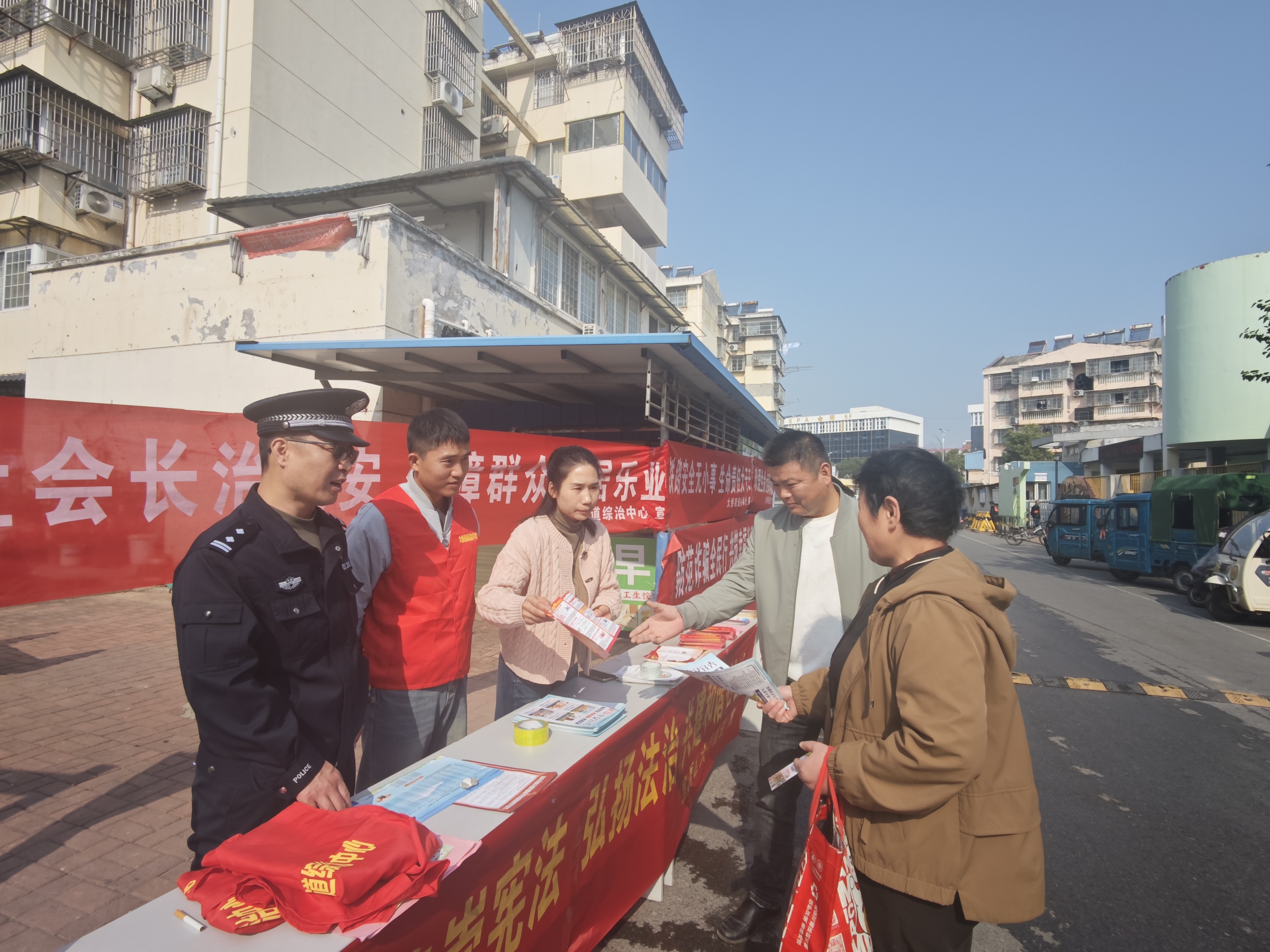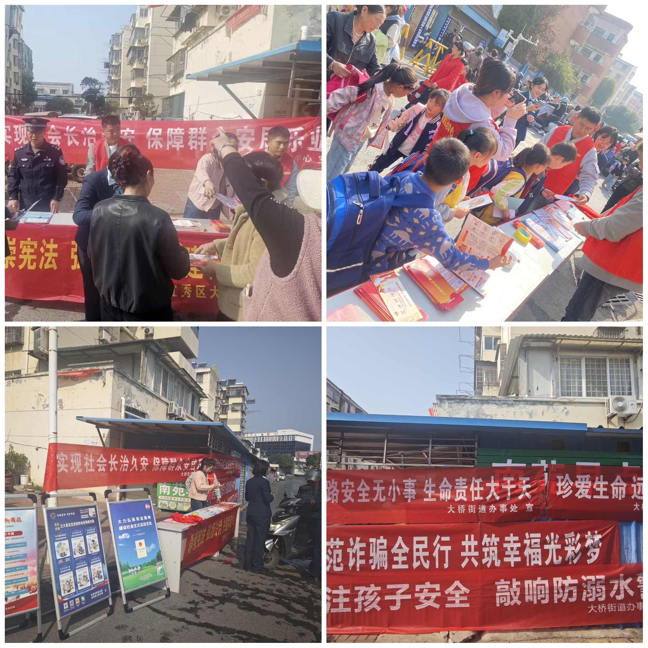 11月14日上午,大桥街道综治中心联合大桥司法所、芭茅巷社区,特邀永安派出所、中国邮政光彩分行共同参与,在同庆南苑小区开展了一场内容丰富的“平安+法治”集中宣传活动,将平安建设、反电诈、反邪教、铁路护路、扫黑除恶、禁毒、防溺水及《民法典》《宪法》知识“打包”送到群众身边,进一步提升辖区居民的法治意识和安全防范能力,筑牢社区平安防线。