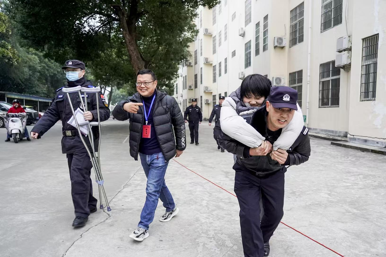 一级、两级、三级……几十级台阶,四个人每次护送考生进出考场,都步子踩得齐,动作轻得像怕碰坏了手里的宝贝。每次走到拐角,背考生的队员都会放慢脚步,紧随其后的朱明祥也跟着调整托举的角度,确保石膏腿不蹭到台阶。