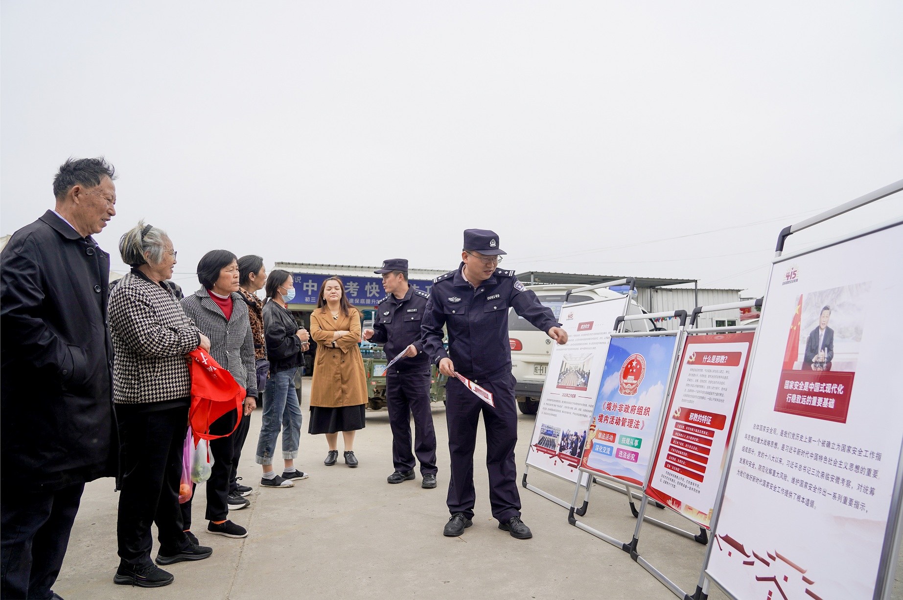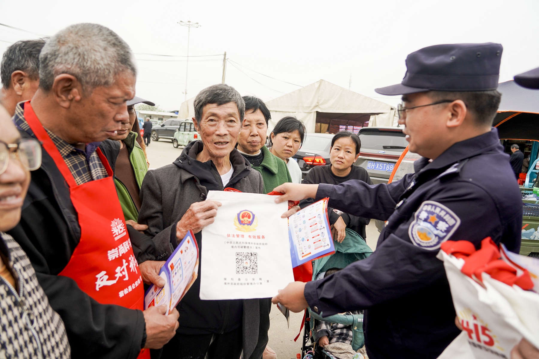 现场,民警依托精心布置的宣传展板,开设“流动普法讲堂”,围绕总体国家安全观,重点讲解国家安全相关法律法规,细致普及境外非政府组织境内活动管理法、反恐防恐、抵制邪教、维护政治安全等实用知识,结合身边案例让晦涩的法律知识变得浅显易懂。每一轮宣讲结束后,民警便将印有国家安全宣传内容的围裙、环保布袋、钥匙扣等小物件逐一发放给参与群众,同时配套送上《境外非政府组织境内活动管理法》《反恐防范知识》等普法手册,实现“实物宣传+手册科普”双向发力。