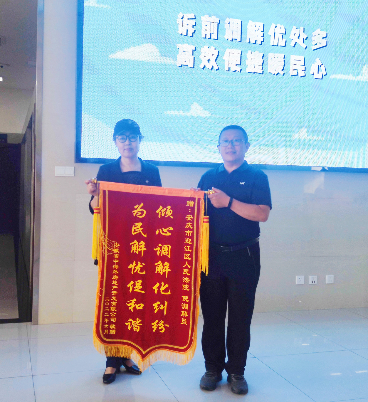 6月14日下午,一公司工作人员手攥一面锦旗来到迎江区人民法院诉讼服务大厅,找到立案庭负责人,要将绣有“倾心调解化纠纷,为民解忧促和谐”字样的锦旗送给该院特邀调解员倪明华。他感叹道:迎江法院诉前调解工作是真抓实干,调解员的专业、敬业让我们感动,这么多纠纷在立案前就得以化解,真好!